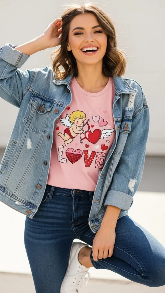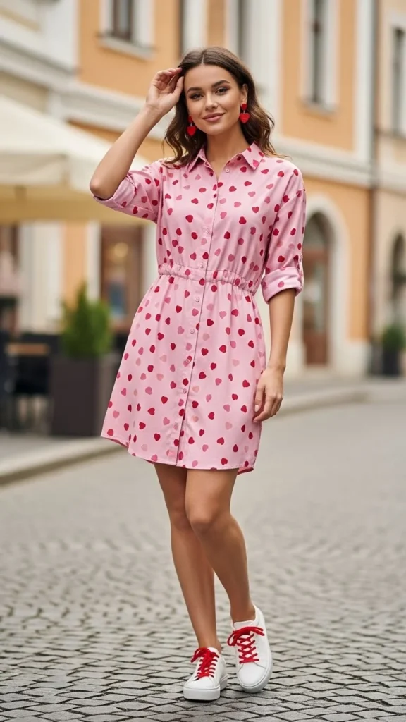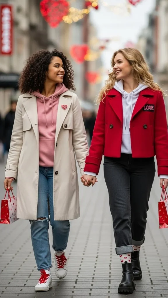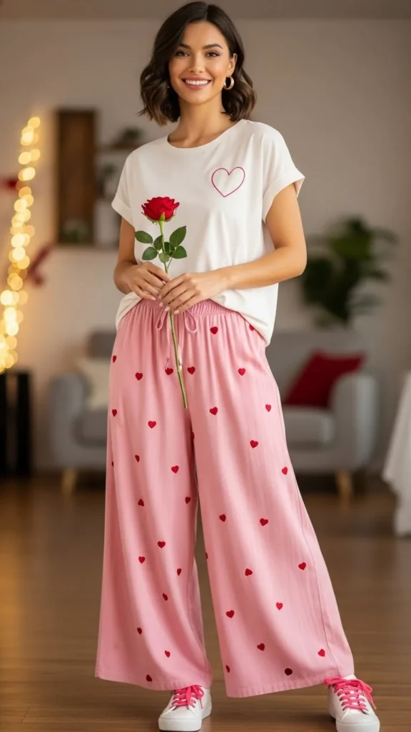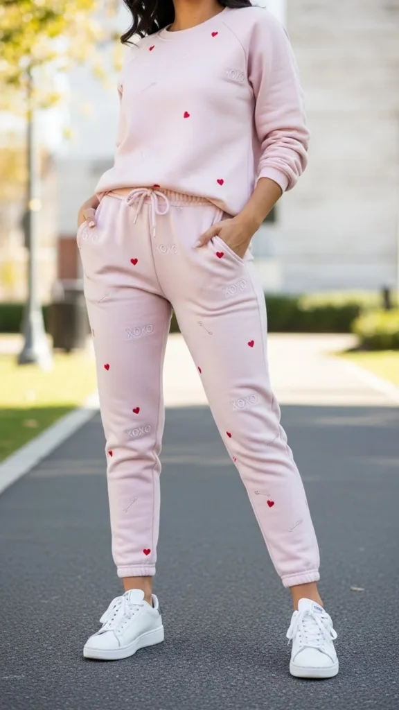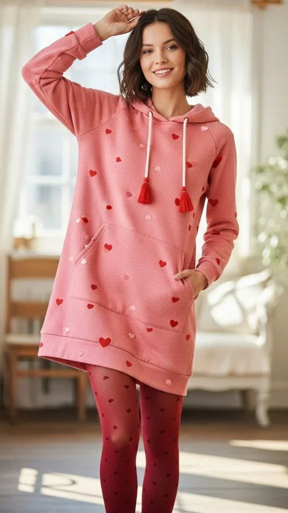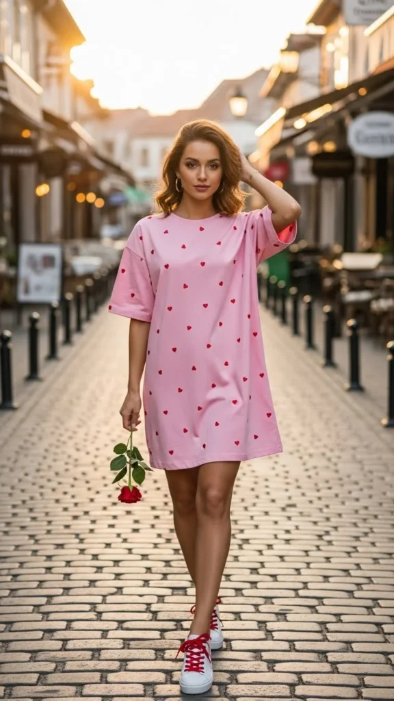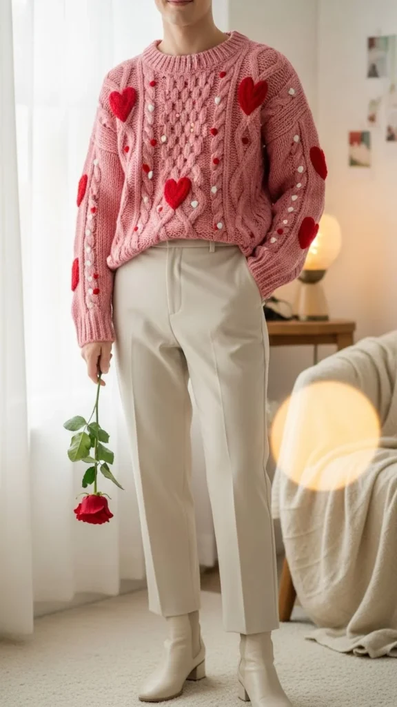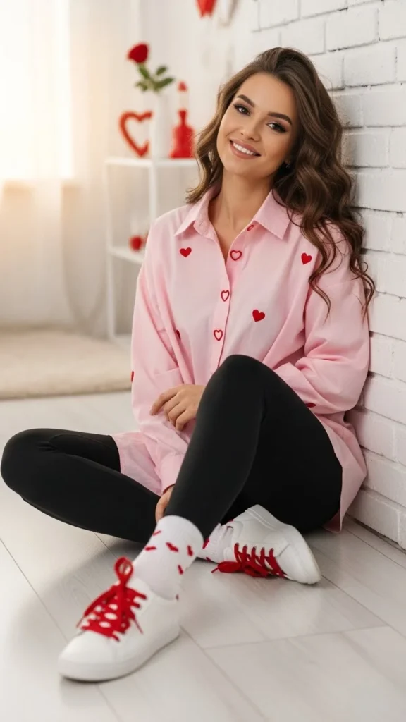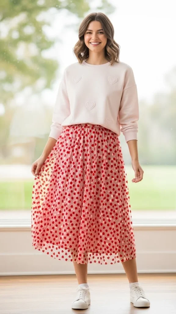 A pink sweatshirt sets a Valentine mood instantly. Straight jeans keep the outfit balanced and comfortable. Choose soft cotton for all-day wear. Light sneakers or flats complete the look. Budget tip: thrifted sweatshirts often look great after a gentle wash.