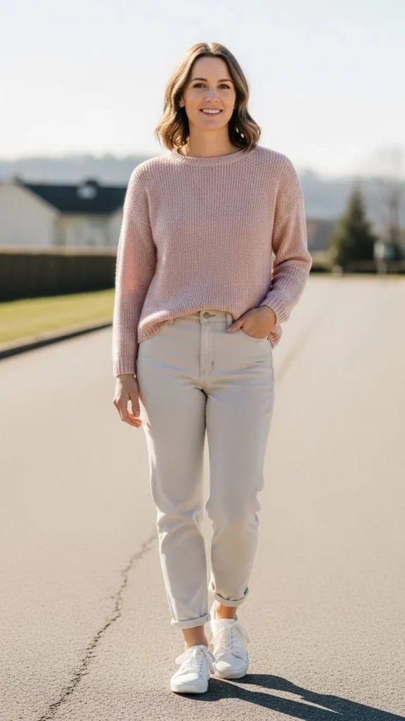 Soft knits feel gentle and welcoming. Light denim keeps it casual. Roll sleeves slightly for ease.