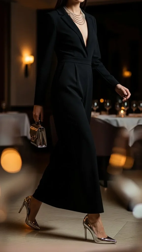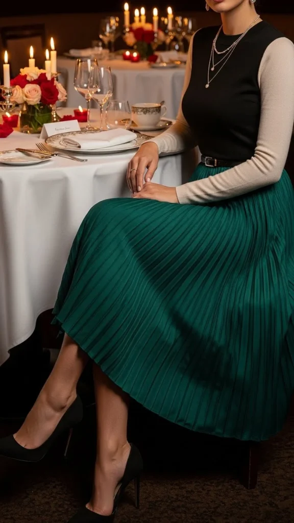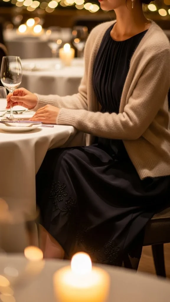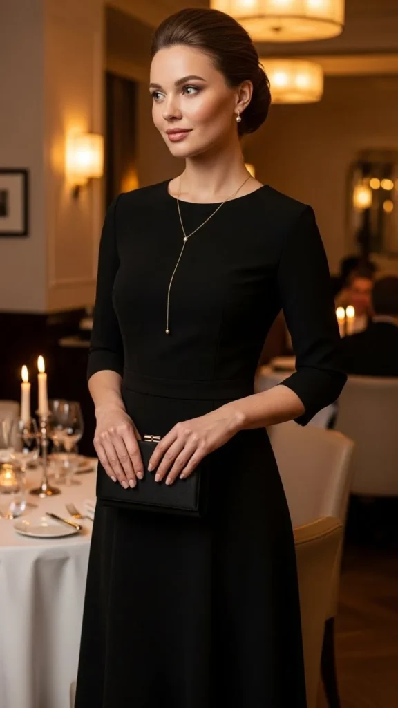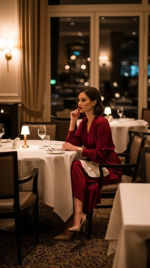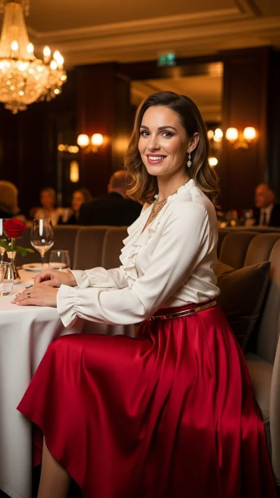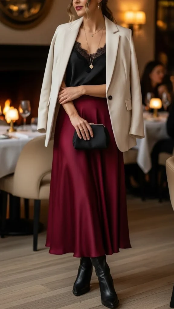 A satin midi dress brings instant dinner elegance. Choose a fluid fabric that moves easily when seated. Minimal heels keep the look polished without discomfort. Keep accessories light so the dress remains the focus. Budget-friendly idea: add a belt or brooch you already own to change the look.