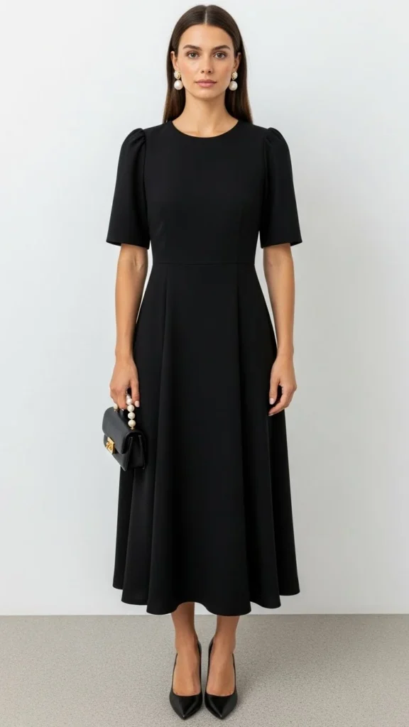 A black midi dress is the definition of timeless. The length feels refined, and it works for almost any plan. Add pearl earrings to keep the look classic without doing too much. If you don’t own pearls, try simple stud earrings and a delicate chain necklace. The key is keeping the jewelry small and clean.