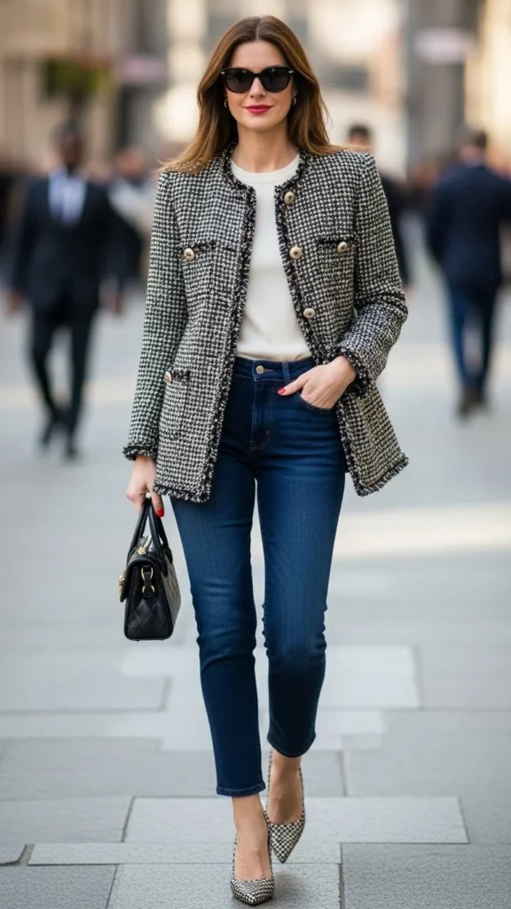 A tweed jacket adds instant structure and polish. Pair it with dark denim to keep it modern and wearable. Under the jacket, wear a simple top in white or black. This keeps the jacket as the focus.