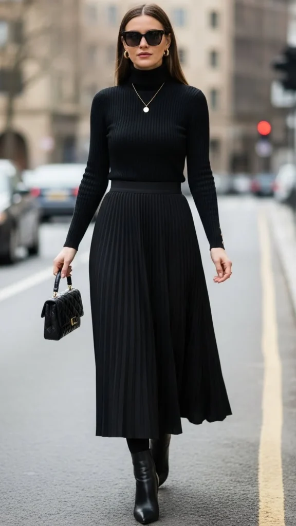A black turtleneck is a clean base. Pair it with a midi skirt for a classic silhouette. Choose a skirt with soft movement, like pleats or a gentle A-line shape. Solid colors work best for a timeless look.