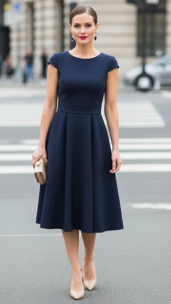 Navy is a classic alternative to black. A navy dress feels elegant and soft. Pair it with nude heels to keep the look clean and lengthen the leg line. If you prefer flats, nude pointed flats also work.