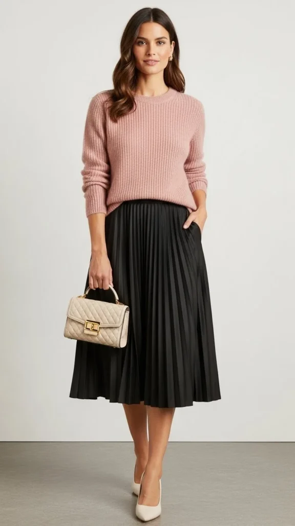 Tuck the sweater slightly at the front. Add flats or low heels. If the skirt waist is loose, a belt solves it. This outfit feels timeless and comfortable for dinner or evening plans.