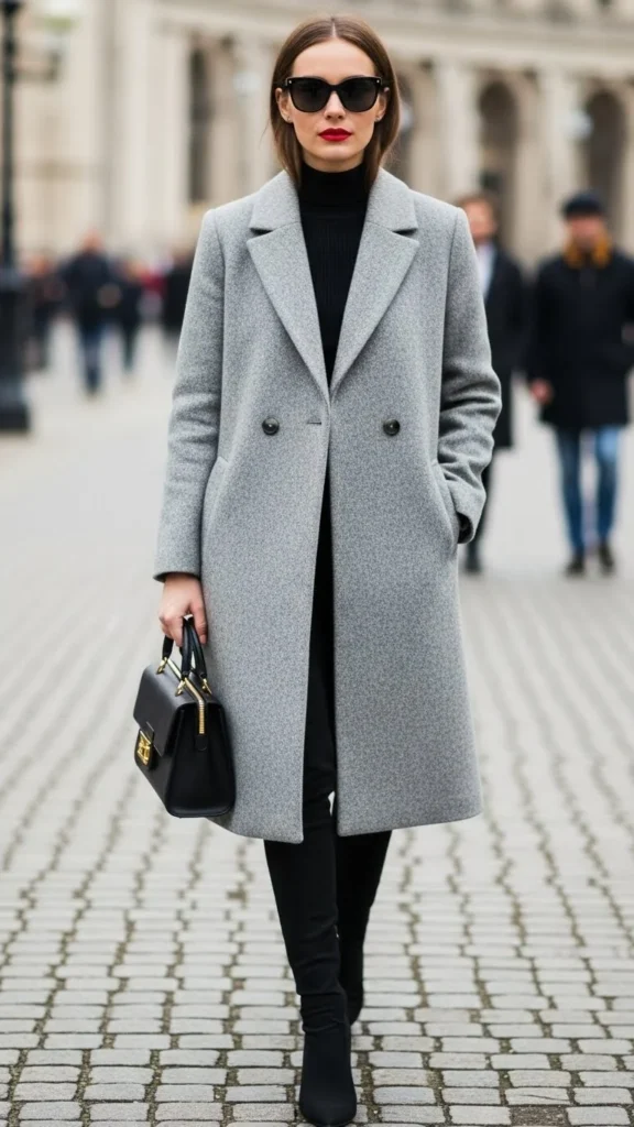 19. Grey Coat With Red Lip and Black Basics
