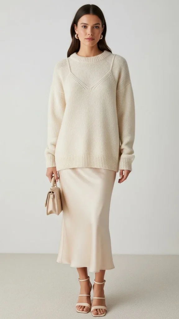 A cream sweater paired with a satin slip skirt feels soft, romantic, and polished. The sweater adds warmth and structure. The skirt adds movement. Choose a sweater that isn’t too bulky. A slightly tucked front keeps the waist defined. For the skirt, look for a simple midi length in champagne, blush, or deep red.