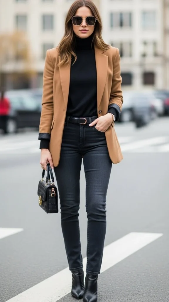 A camel blazer adds warmth and polish. Pair it with dark jeans and a simple top. This outfit is easy to recreate and works for many plans.