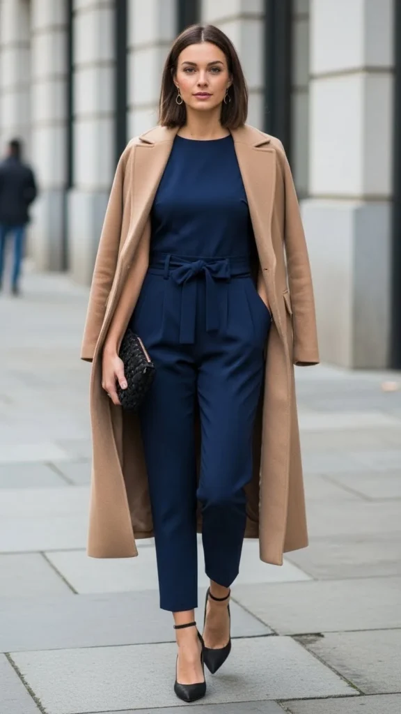 A minimal jumpsuit is elegant because it’s clean and simple. Add a long coat for structure. Choose neutral shades like black, navy, or cream. Keep accessories small so the lines stay neat.