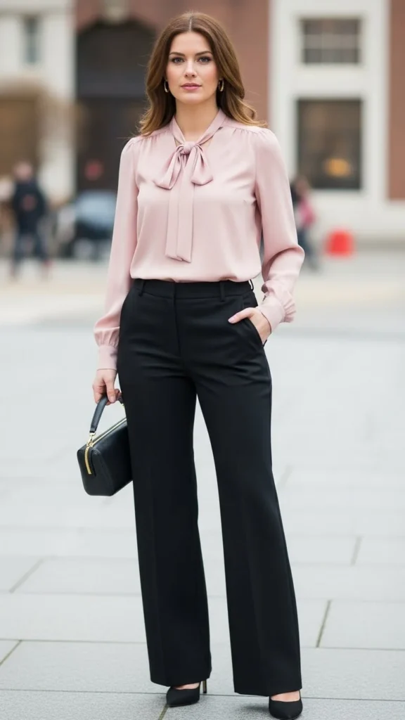 23. Soft Pink Blouse With Black Trousers
