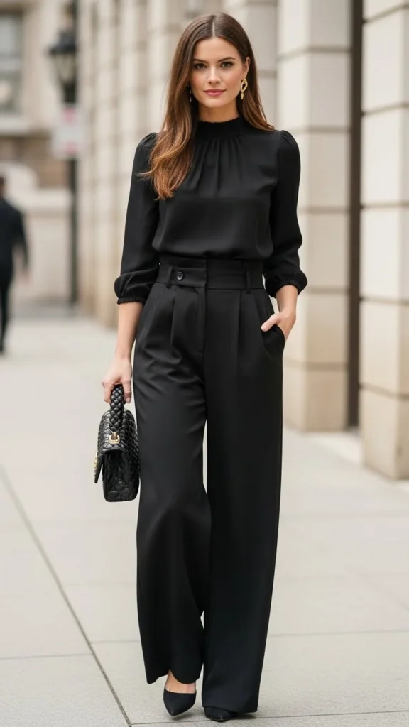 For a budget option, thrift wide-leg pants and hem them to the right length. That one change makes them look tailored. Shoes can be pointed flats, loafers, or low heels. Keep accessories minimal. This outfit feels elegant, comfortable, and easy to wear again.