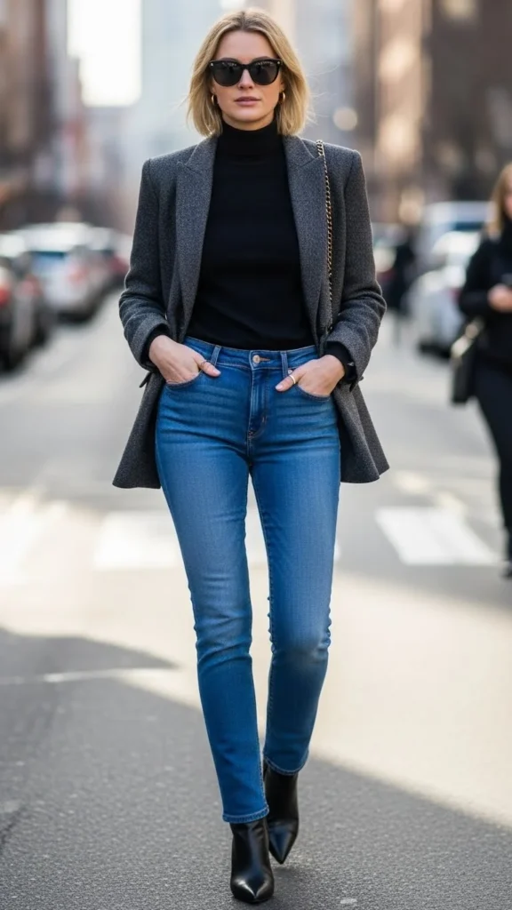 A tailored blazer makes denim feel dressed up fast. Pick straight-leg jeans in a dark wash for a cleaner finish. Under the blazer, wear a fitted top or a simple camisole. Neutral shades like black, white, or beige keep it classic.
