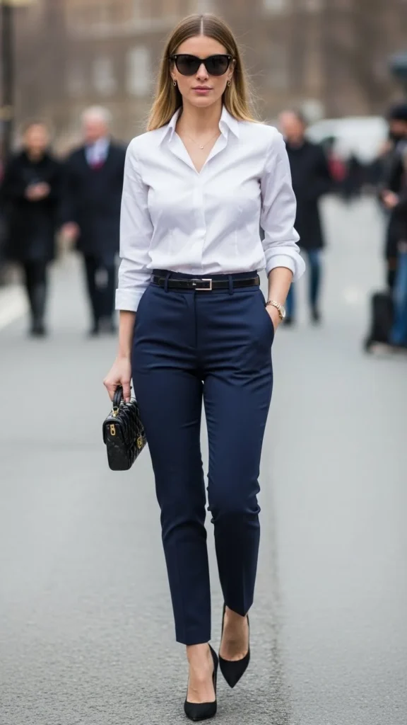A crisp white button-down always looks polished. Pair it with tailored trousers for an elegant outfit that works year-round. Tuck the shirt in and add a belt for structure. Choose trousers in black, camel, or charcoal.