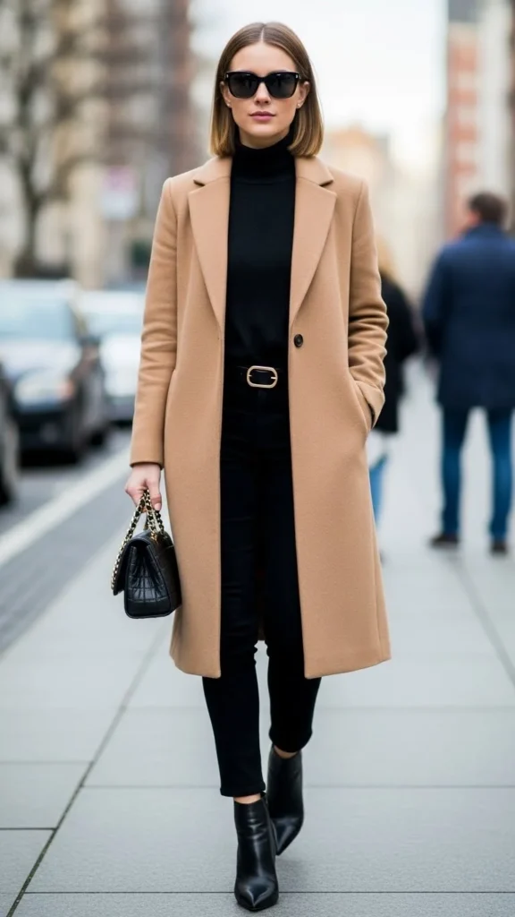 7. Camel Coat Over All-Black Outfit