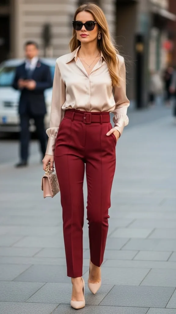 A satin blouse adds softness and shine without looking flashy. Pair it with high-waist pants for a clean shape. Choose pants that sit comfortably at the waist and fall straight. Black, cream, or deep brown works well.