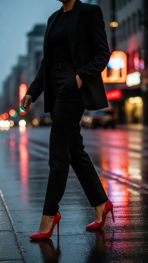 13. All-Black Outfit with Red Shoes