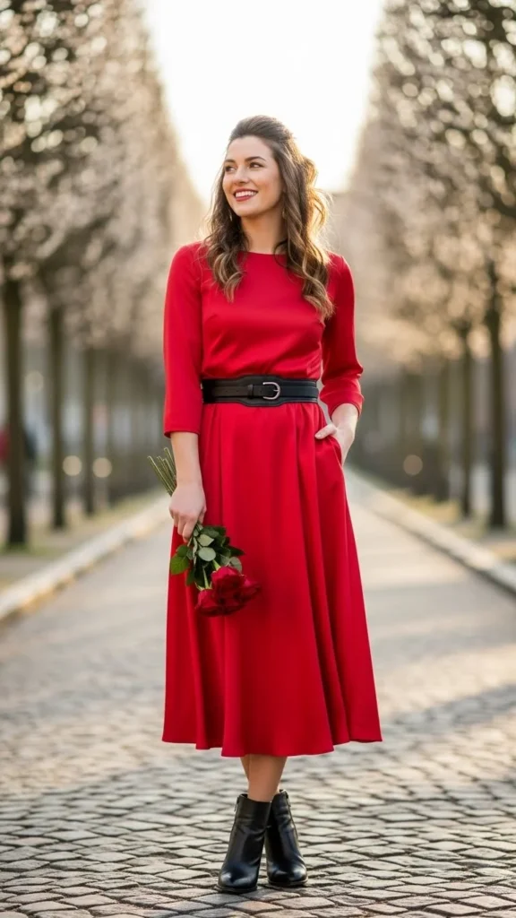 A red knit dress brings instant Valentine charm while staying comfortable. Look for stretchy fabric that moves easily. Pair it with ankle boots you already own. Black, tan, or beige work well. Add a thin belt to shape the waist if needed. Layer with a long coat or cardigan in cooler weather. This look works for day or evening plans. Budget tip: sweater dresses are often easy to find during seasonal sales or thrift shopping.