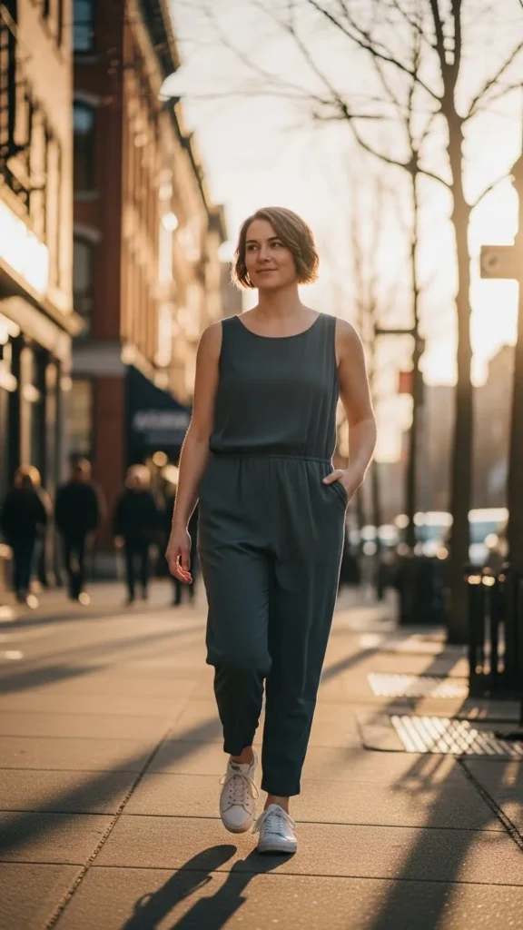 One-piece outfits save time. Sneakers add comfort. Budget tip: jumpsuits reduce the need for extra styling.