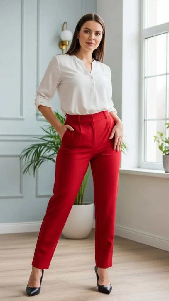 7. White Blouse and Red Trousers