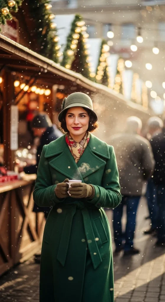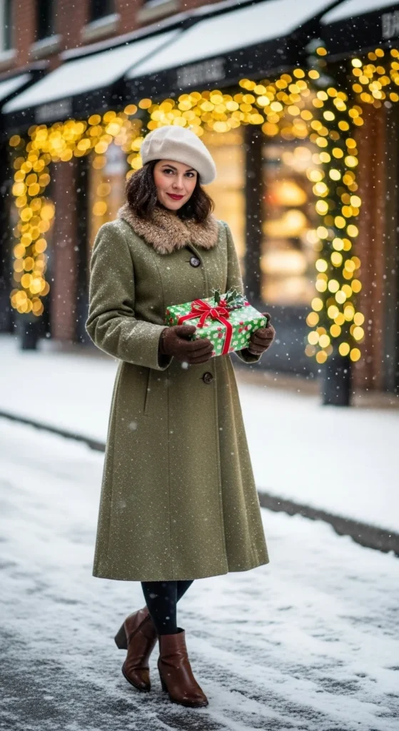 You can easily find a beret at thrift stores or even in old winter sections at local markets. If the coat feels plain, add a small pin at the collar or a slim belt to shape the waist. Wear ankle boots or simple flats depending on comfort. This look is ideal for outdoor gatherings, Christmas markets, or evening walks with friends and family. It feels classic and put together, while still being warm and practical.