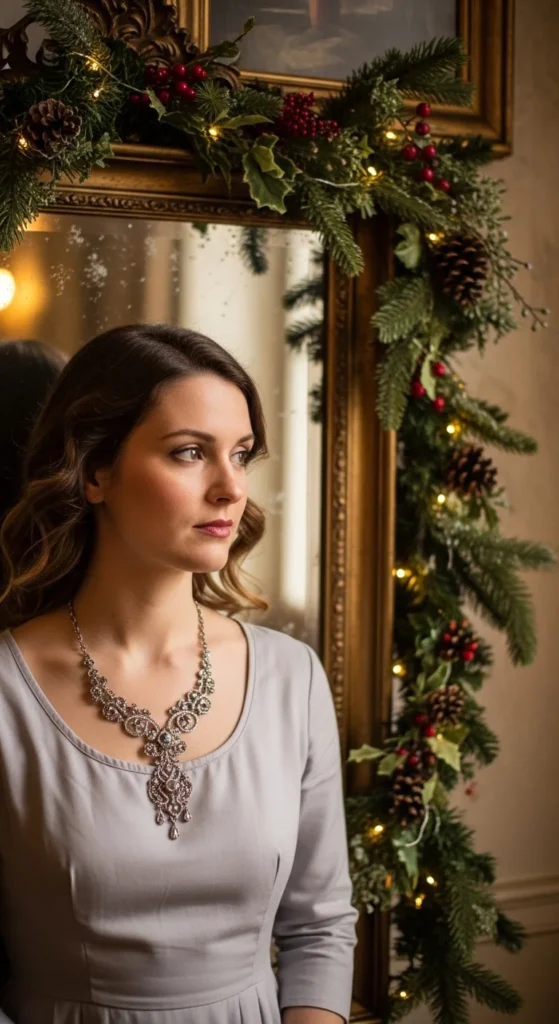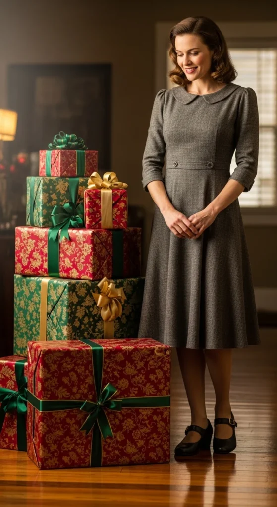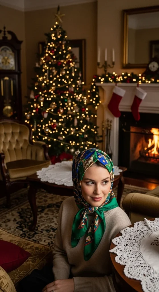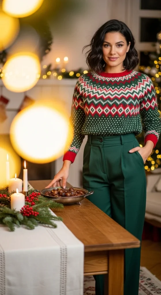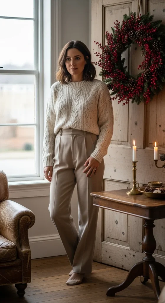 You can find vintage-style trousers in thrift shops or even borrow from a family member’s older wardrobe. If they are too long, roll the hem or use iron-on tape to adjust. Add simple loafers or ankle boots for comfort. A small brooch pinned to the sweater adds a charming detail without extra cost. This outfit is perfect if you want a timeless look that still works for normal daily wear during the holidays.
