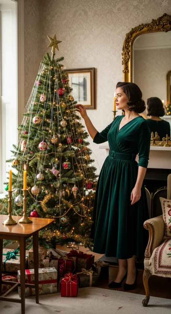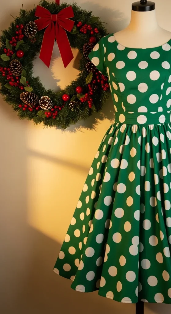 These dresses are easy to find online at affordable prices. You can also turn a long skirt into a DIY swing dress by pinning it to a fitted top. Add vintage-style curls or a simple bun. Pair with low heels or Mary Jane shoes. This outfit feels joyful and perfect for dancing around the Christmas tree.