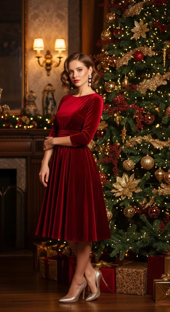 A red velvet dress instantly sets a festive mood without trying too hard. Focus on a tea-length cut that falls between the knee and ankle. This style was popular in the 1950s and still looks graceful. Pair it with simple gold or nude heels to keep the attention on the fabric. If velvet feels too formal, soften it with a simple cardigan or cropped sweater.
