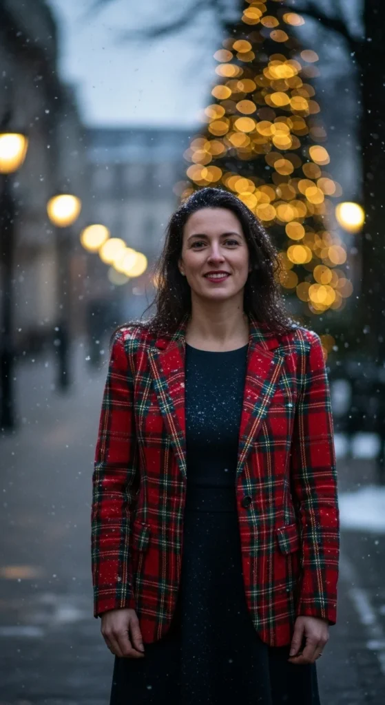 A tartan blazer adds structure and classic pattern to any simple outfit. Layer it over a plain black or cream dress. The pattern carries the Christmas vibe on its own.