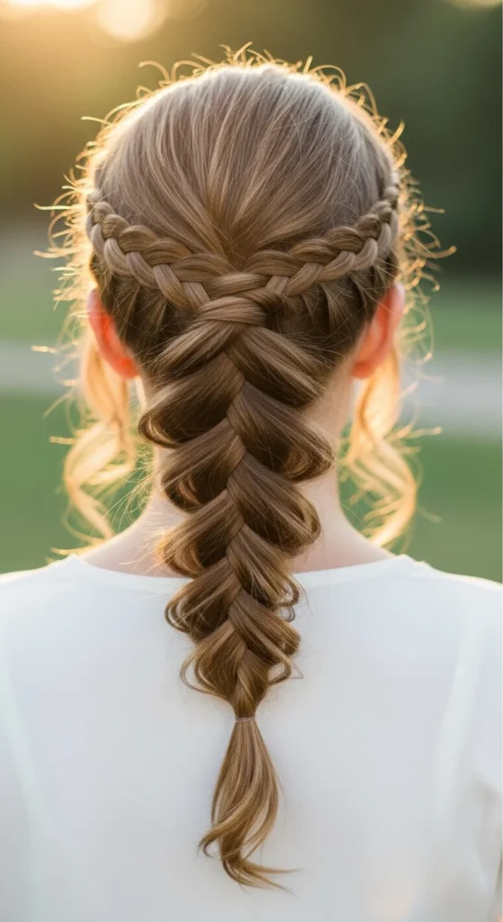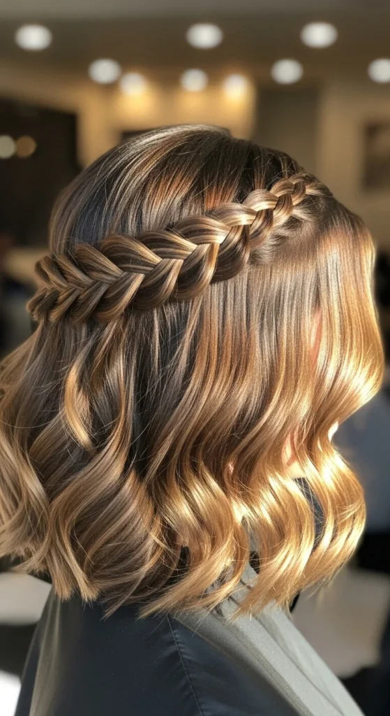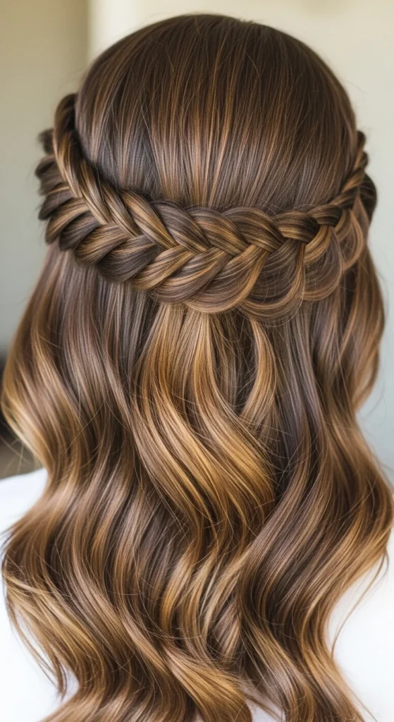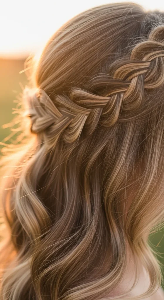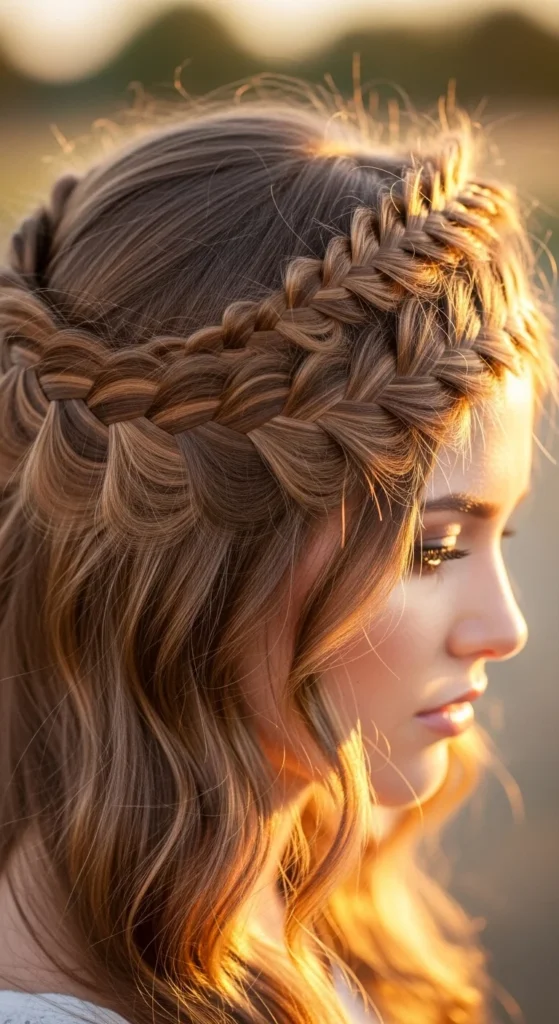 This is a crown look that still keeps hair down. Start near one ear and braid around the head like a halo while dropping strands. You’ll get a ribbon-like cascade around the crown area.