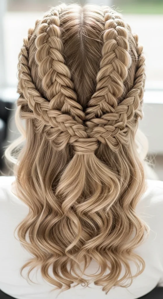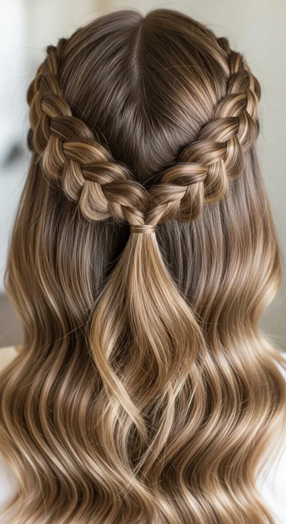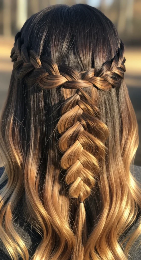 A half-up finish keeps things easy and pretty. Create a waterfall braid from one side to the back, then secure it in the center. You can stop there, or do a second waterfall from the other side and join them.