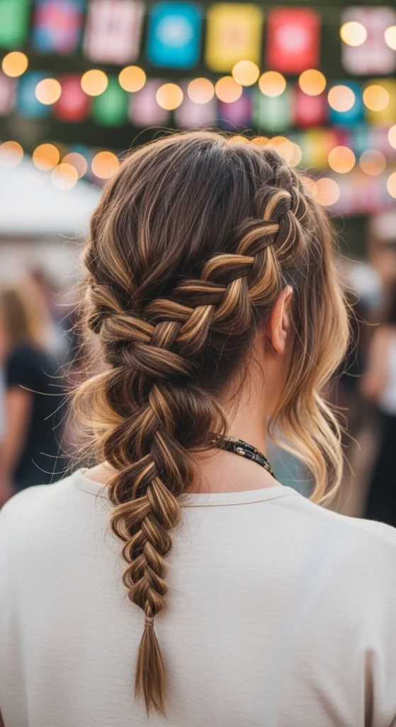 This is great for festivals because it looks textured and relaxed. Pair it with soft waves and a casual outfit. After finishing, tug the braid loops gently so it looks fuller.