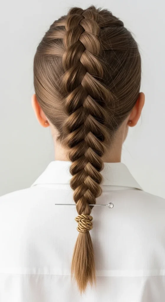 Pin the braid securely at the back. Add one small pin or clip if you want sparkle, but keep it simple.