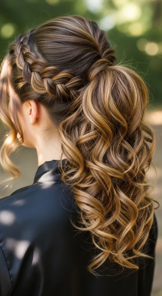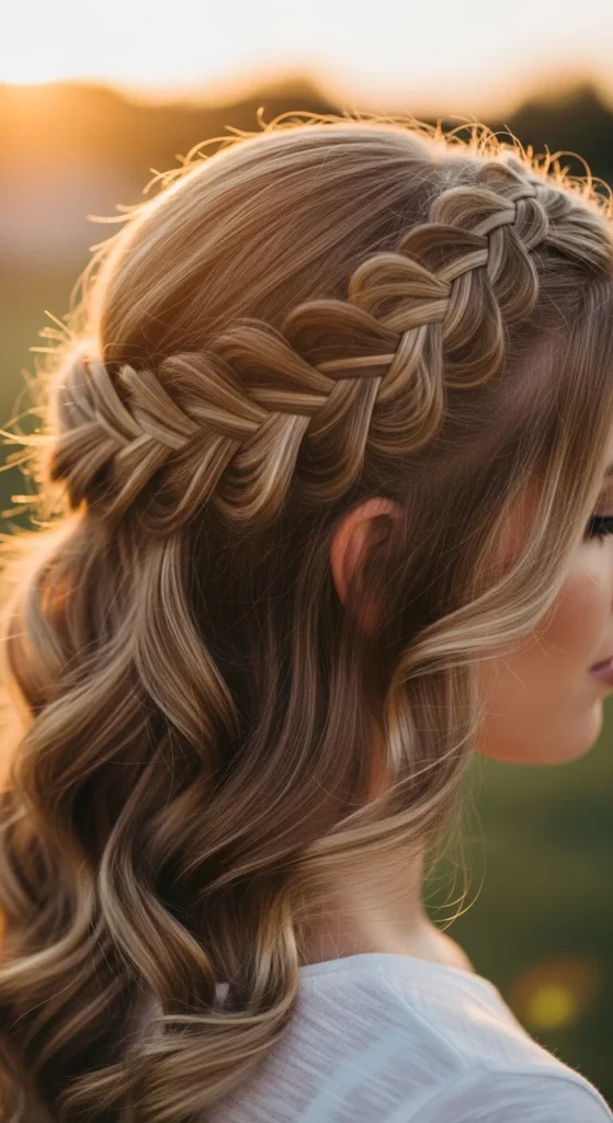 This is a classic “special night” look. Do a waterfall braid across the crown area. Curl the rest into soft curls and brush them lightly for a gentle finish.