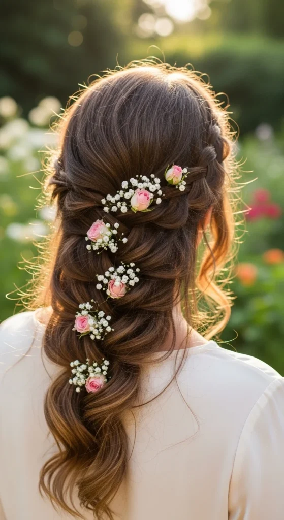 This is perfect for spring and summer. Do a waterfall braid and tuck tiny flowers into the braid edges every few inches.
