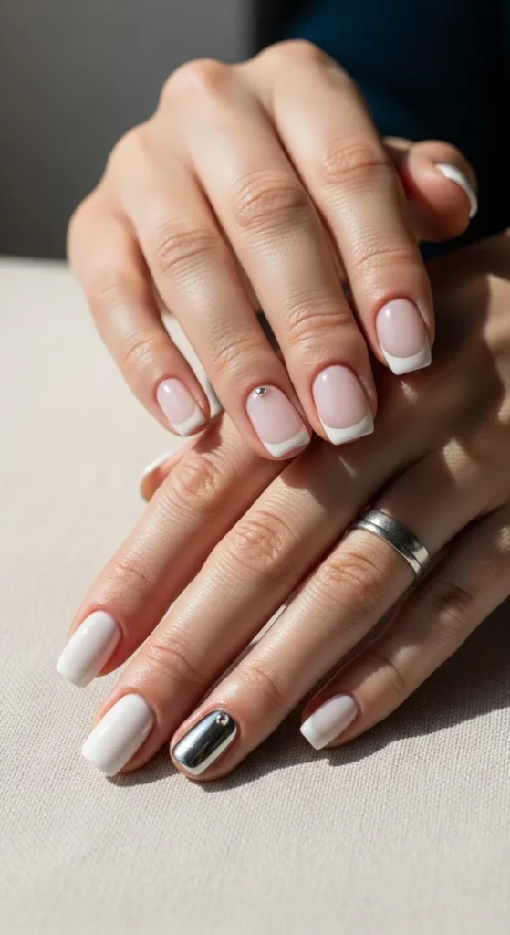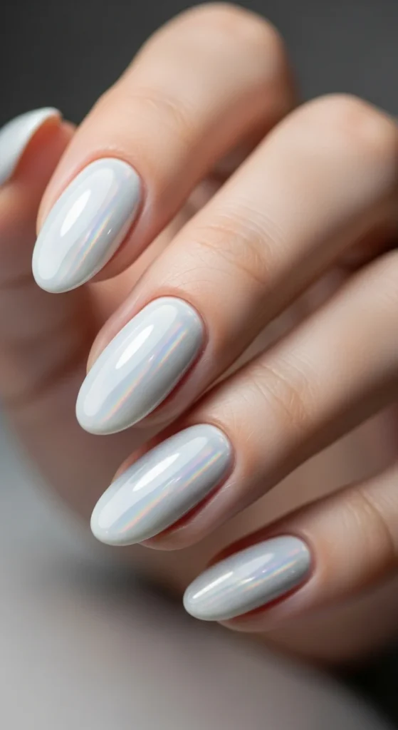 A sheer chrome overlay makes white nails look icy and modern. It’s perfect in cooler months but still wearable anytime.