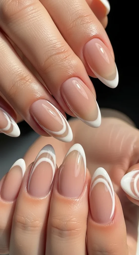 Use a nude base. Then draw a thin white line along the tip edge. Keep it crisp but delicate.