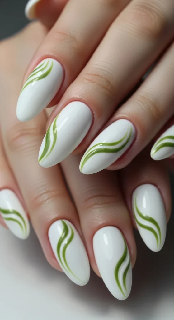 A small pop color makes white nails feel modern and fun. Green swirls on white are a clean contrast.