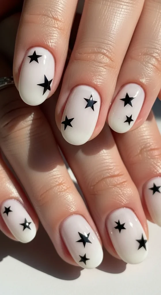 Use milky white base, then add tiny black star stickers or draw simple star shapes with a fine pen.