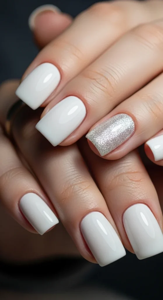 Paint nails milky white. On one accent nail, apply fine glitter in a half-moon shape near the cuticle.