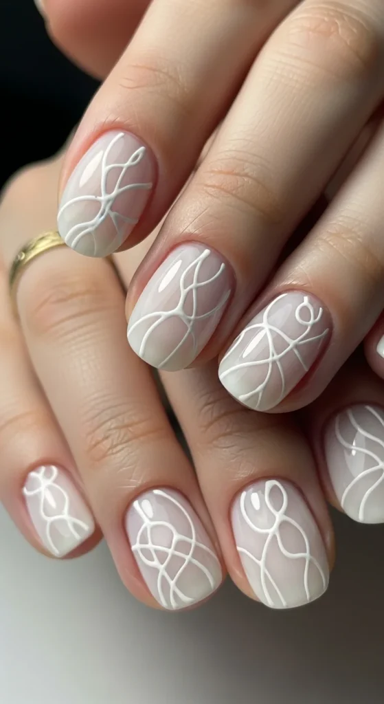 Start with a milky white base. Use a thin brush to draw soft swirl lines in a slightly brighter white. Keep the lines light and wavy. They don’t need to match perfectly.