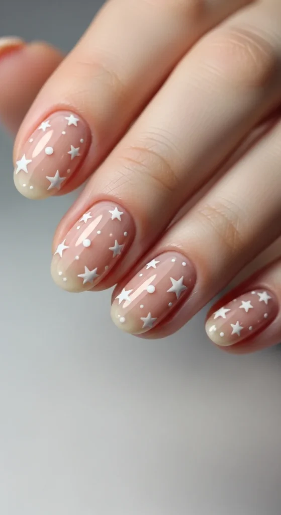 Use a nude base, then add small star decals or draw tiny stars with a dotting tool. Keep it to one or two nails for a minimal look.