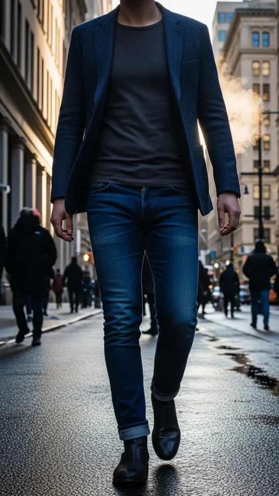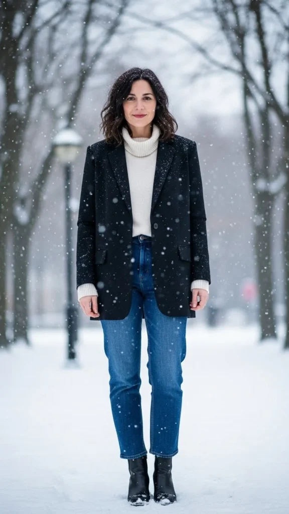 Cropped blazers create shape near the waist. High-waist jeans pair smoothly. A thermal tee adds warmth. This outfit suits casual winter dressing. Choose jeans in dark washes. Add ankle boots for height.
