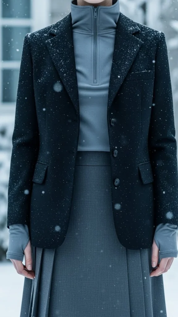 A navy blazer offers a refined tone. A pleated skirt moves beautifully in winter air. Thermals keep heat close. This outfit suits mild winter days. Choose skirts in midi length. Add tights if temperatures drop. Pair with soft knit scarves.
