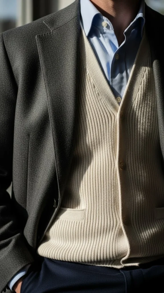A knit vest adds warmth. A button-up adds clean structure. The blazer ties the outfit together. This combination suits office routines. Choose vests in wool blends. Keep shirt colours soft. Add trousers or jeans depending on your schedule.