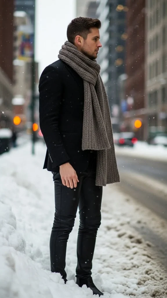 Leather pants add edge. A scarf adds warmth. The blazer sharpens the outline. This look suits evenings or social plans. Choose faux-leather pants for comfort. Add heeled boots or polished sneakers. Keep scarf textures thick.