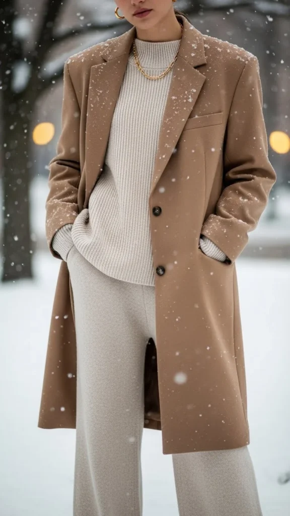 Cashmere-style knits pair well with structured blazers. Tailored pants sharpen the bottom half. This combination suits polished winter routines. Choose sweaters in calm tones. Add leather boots or loafers.