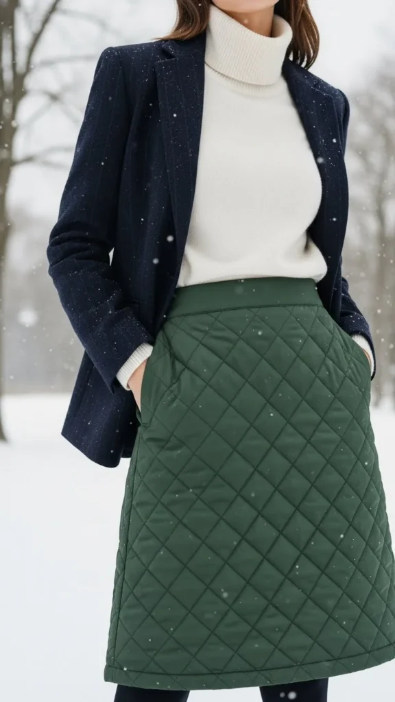 A quilted skirt brings winter personality. A turtleneck adds warmth. The blazer shapes the upper half. This pairing suits creative winter outfits. Choose skirts in neutral or deep tones. Add tights for comfort.