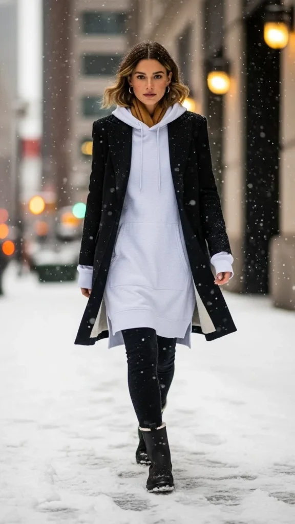 A long hoodie keeps things relaxed. Leggings offer comfort. The blazer adds structure. This pairing suits quick errands or travel. Choose neutral hoodies. Add sneakers or warm boots. Keep the blazer slightly oversized.