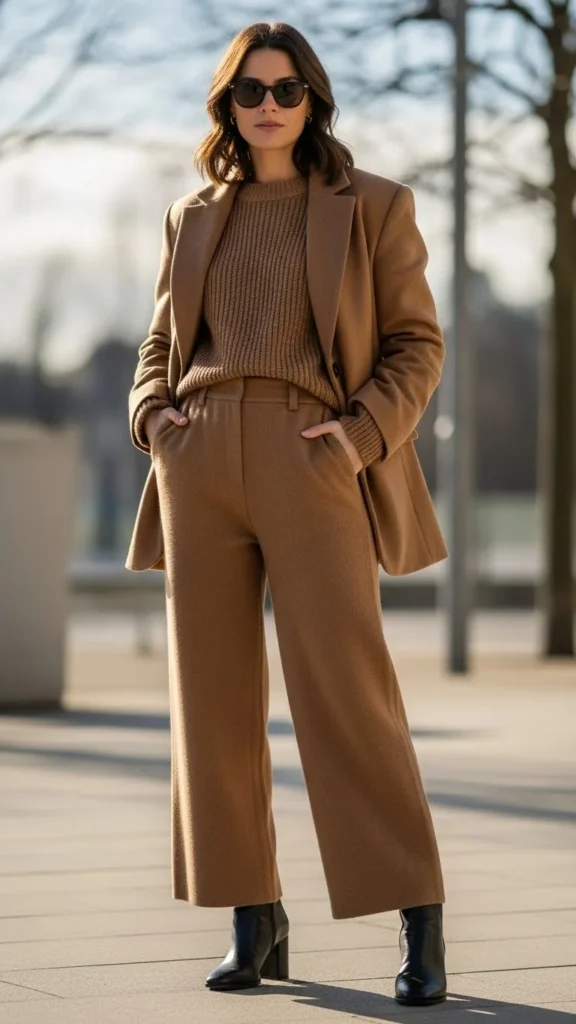 A wool blazer adds thickness and shape. A knit set keeps the outfit soft. Ankle boots add height. This look suits coffee runs or meetings. Choose knit sets in ribbed or smooth textures. A wool-blend blazer pairs well with them. Add a long scarf inside the blazer for warmth. Keep accessories simple so the knit texture stands out.