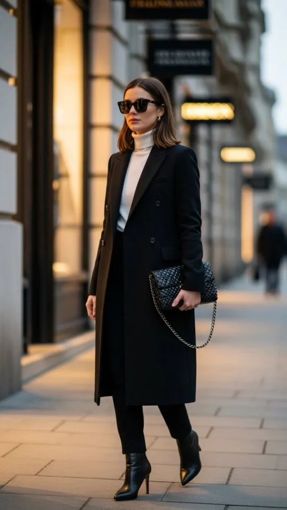 A black blazer frames the shoulders. A turtleneck adds instant warmth. Straight jeans keep the outfit simple. This pairing suits workdays or casual outings. Choose a turtleneck in a muted tone for easy blending. Straight jeans stack nicely over ankle boots. Add a belt to shape the waist. A neutral bag keeps the look tidy. This combination is easy to recreate using items already in your wardrobe.