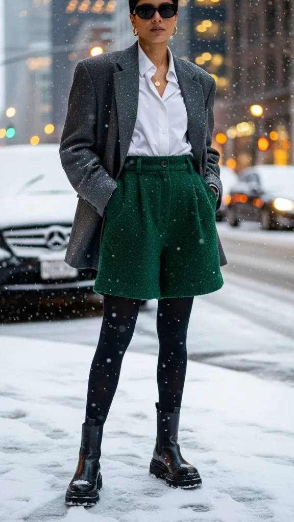 Wool shorts add winter character. Tights protect your legs. The blazer provides polish. This outfit suits mild winter days. Choose shorts in darker tones. Add ankle boots.